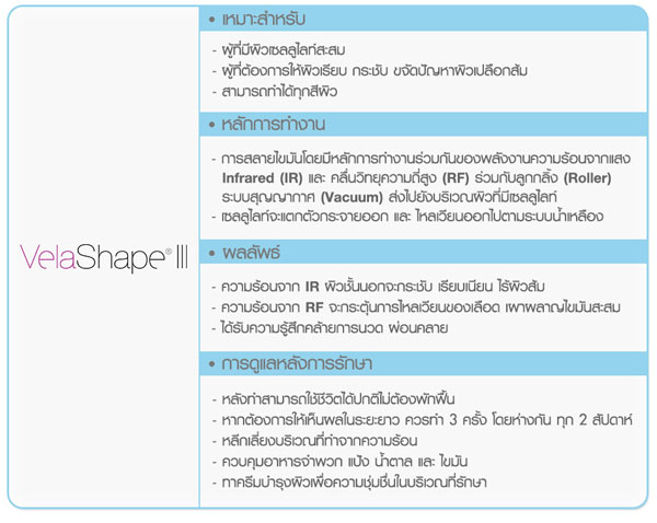 Velashape III เทคโนโลยีที่ผสมผสานการทำงานของ คลื่นวิทยุ (RF) , พลังงานแสง Infared (IR) ร่วมกับลูกกลิ้ง (Roller) ระบบสุญญากาศ (Vacuum) ที่มีประสิทธิภาพแห่งการสลายเซลล์ไขมันออกมาในรูปแบบของการนวดควบคู่ไปกับการ ปล่อยพลังงานคลื่นวิทยุ (RF) จะช่วยเข้าไปกระตุ้นการทำงานของคอลลาเจนชั้นลึก โดยที่ พลังงานแสง (IR) จะช่วยให้คอลลาเจนชั้นตื้นกระชับขึ้น ร่วมกับการนวดด้วยลูกกลิ้งที่จะช่วยให้พลังงานเหล่านี้กระจายตัวเข้าไปสลายไขมันได้อย่างมีประสิทธิภาพมากยิ่งขึ้น โดยที่ไม่เจ็บตัว สบายตัว ได้รับความรู้สึกคล้ายการนวดผิว