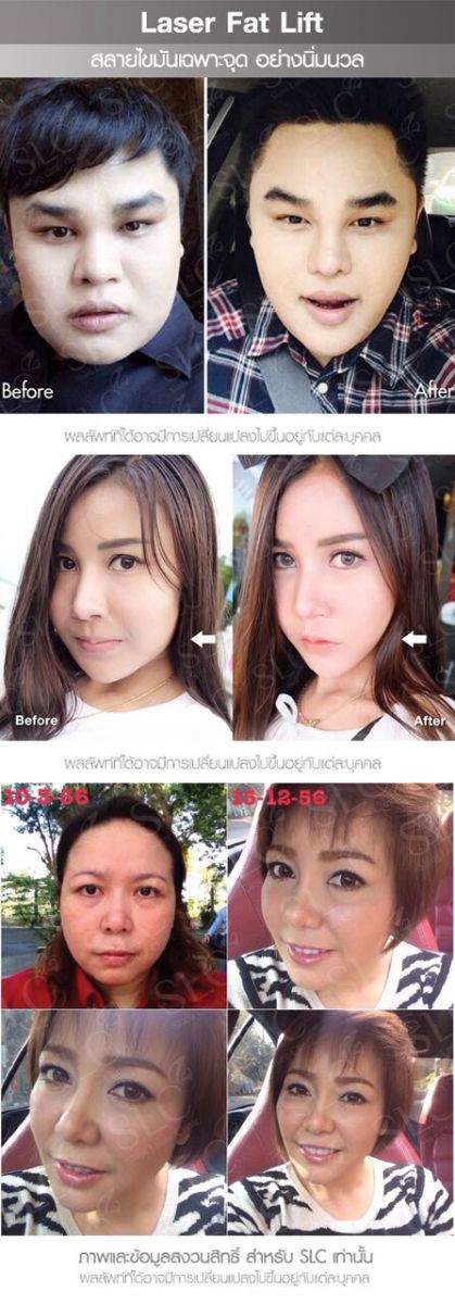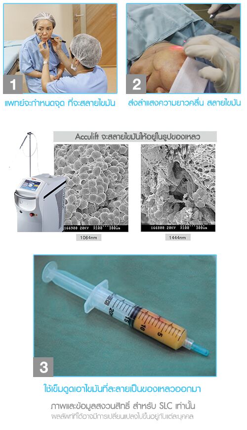Laser Fat Lift (Accu Lift) is a method of using lasers with an optimum wavelength for fat elimination (1,444 nanometers) through a small fiber optic tube inserted to the hypodermis fat layer. The lasers will stimulate fat bodies elimination into fluid form, which will be sucked out by a blunt needle of 1 – 1.5 mm diameter. Depth levels of the needle to suck out fat fluid depends on the thickness of hypodermic fat of the individual, which averages around 3 mm – 1cm. This technology is suited for people with extra facial fat, without damage to surrounding tissues, and is painless or cause only mild discomfort. It provides firmer and smooth skin textures with a small incision (1-2 mm), this procedure is safe and U.S. and Thai FDA- approved.